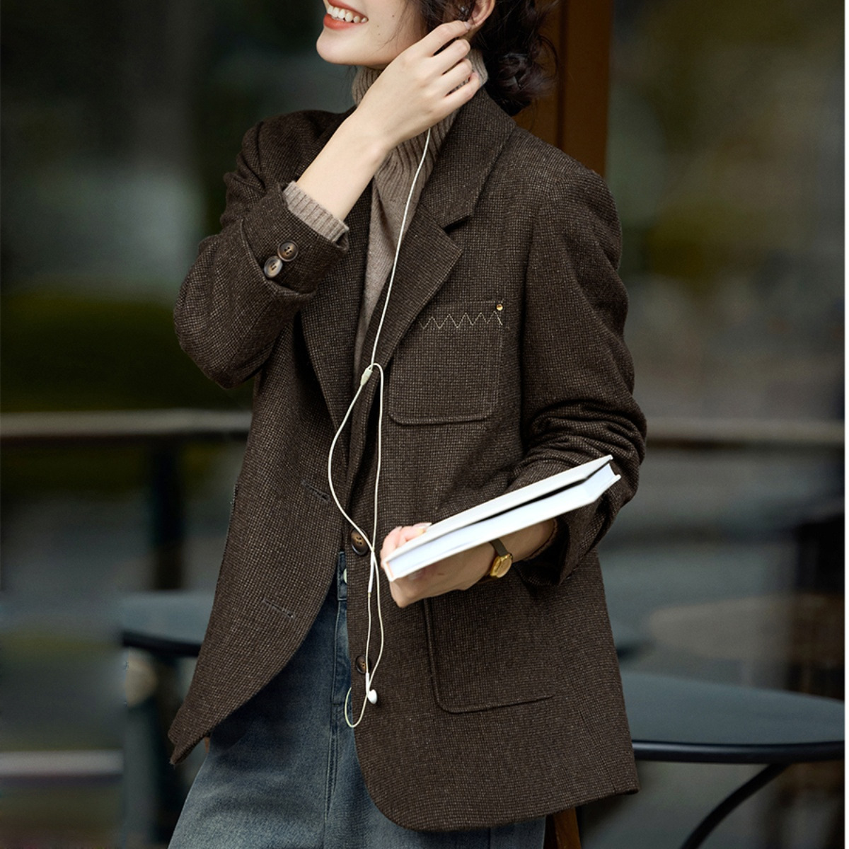 2025秋冬新款复古休闲毛呢西装外套女小个子宽松显瘦小西服