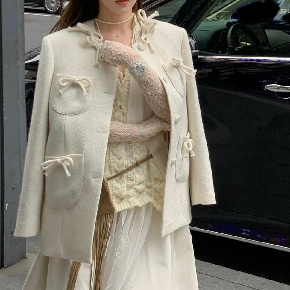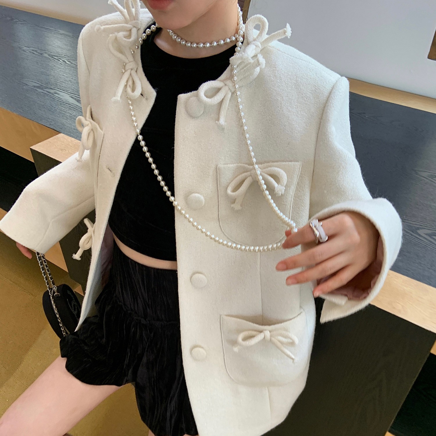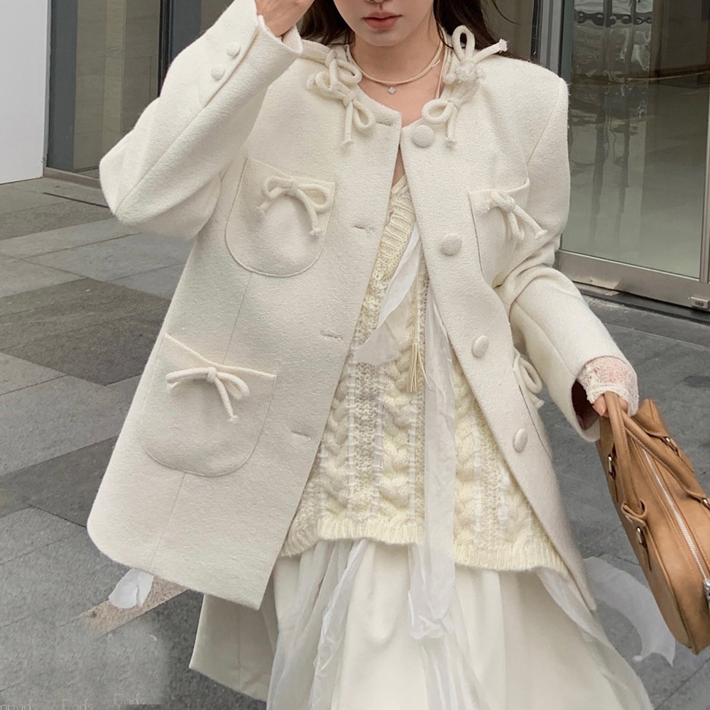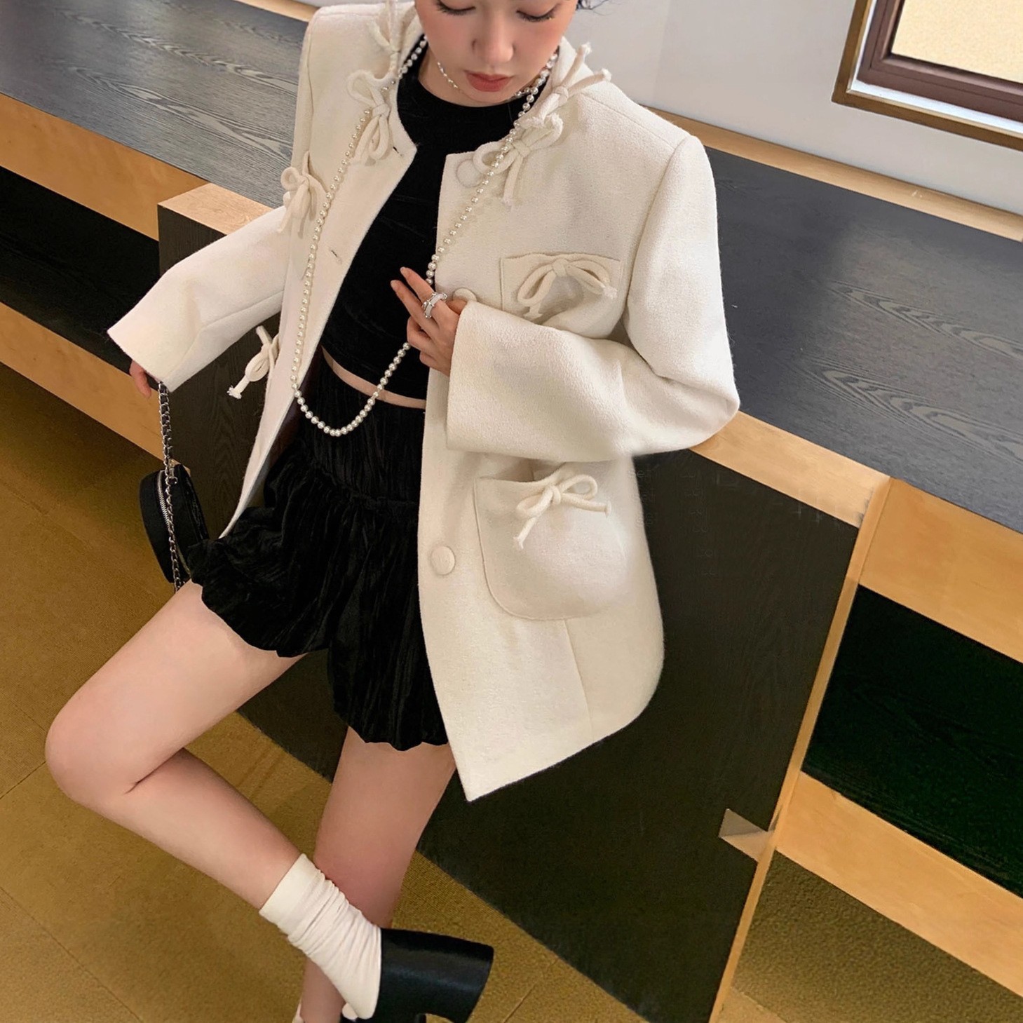 韩版宽松女装外套蝴蝶结设计感毛呢大衣秋冬外套百搭粗花呢西装
